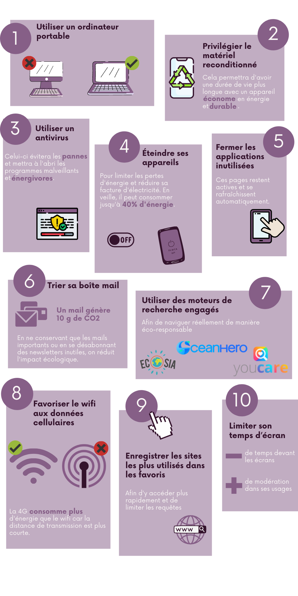 Quoi de mieux pour se lancer que de mettre en place des écogestes au quotidien ? Effectivement, chacun de nous peut agir à son échelle : des gestes simples et efficaces permettent de diminuer l’impact négatif du numérique sur notre environnement. Et si le plus grand nombre s’y met, le résultat sera probant et visible à l’échelle collective.